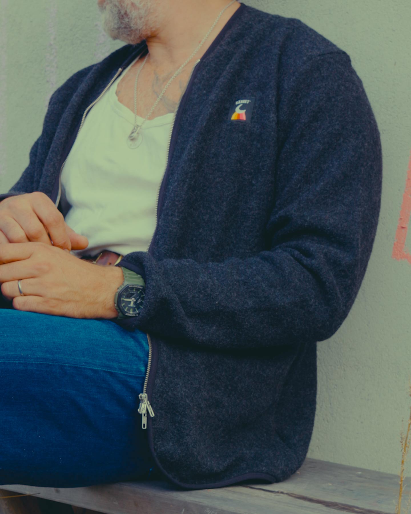 Wool cardigan in 100% boiled wool. A material that breathes and transports moisture outwards, which gives a warm and dry feeling. The reason the fabric is boiled is to give the wool additional quality properties. Boiled wool resists moisture and cold better than regular wool. A garment that can be used both indoors and outdoors. Outdoors as a reinforcement garment and indoors as a warm sweater/cardigan.